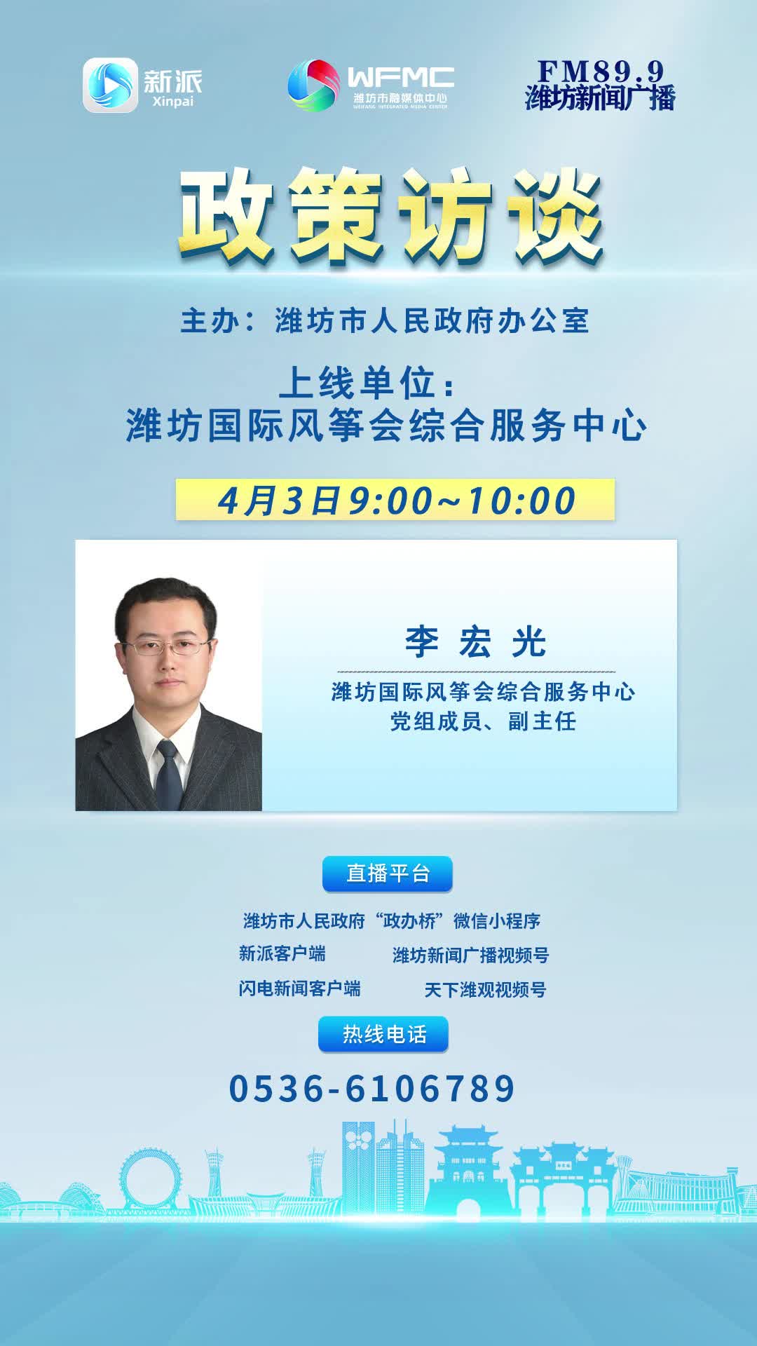 4月3日上午9:00~10 00,濰坊國際風(fēng)箏會綜合服務(wù)中心黨組成員、副主任李宏光將走進市融媒體中心新聞頻率《政策訪談》欄目直播間,敬請關(guān)注!