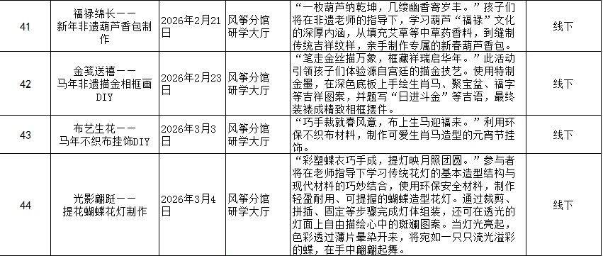 活動(dòng)內(nèi)容:為豐富孩子們的假期生活,增進(jìn)親子間的互動(dòng)與情感交流,同時(shí)傳承和弘揚(yáng)中華優(yōu)秀傳統(tǒng)文化,“童享書香”非遺公益課堂特別推出春節(jié)親子體驗(yàn)活動(dòng),誠邀廣大讀者和孩子一同開啟一場(chǎng)充滿年味與非遺魅力的奇妙之旅。