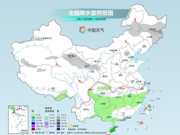 內(nèi)蒙古東北部、黑龍江南部、新疆伊犁河谷、西北地區(qū)中部等地部分地區(qū)有小雪或雨夾雪,其中,黑龍江東南部、甘肅河西等地部分地區(qū)有中到大雪。江南大部、西南地區(qū)東部、華南南部和西部等地部分地區(qū)有小雨,其中,海南島等地部分地區(qū)有中雨。