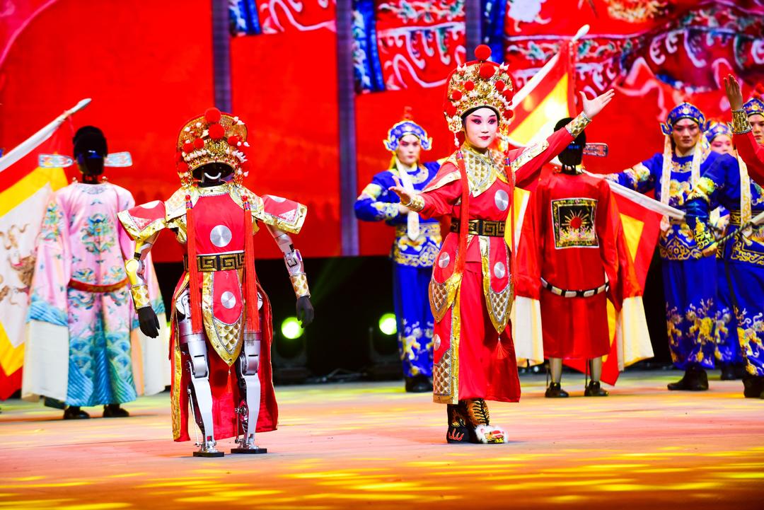 2月14日晚,2026山東省機器人春節(jié)晚會在濟寧舉辦。戲曲聯(lián)唱《人機戲曲串燒》節(jié)目中,機器人著戲服表演。 ( 記者 呂光社 報道)