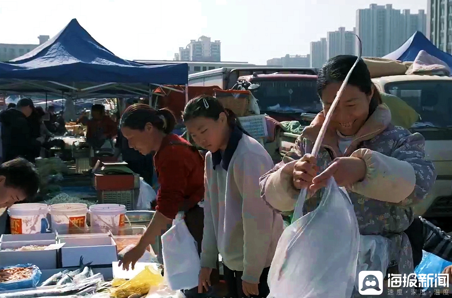 今天的生意特別忙,小小的海鮮攤前人頭攢動(dòng),顧客們七嘴八舌地詢問(wèn)價(jià)格、品質(zhì),李俊逸逐一介紹,略帶一絲學(xué)生的拘謹(jǐn),但業(yè)務(wù)十分熟練。學(xué)校放假后,她沒(méi)急著享受悠閑,而是連續(xù)一周來(lái)到大集上,幫家里照看生意。一旁的家人們也忙著接待顧客、稱量貨物、打包海鮮。臨近年關(guān),生意實(shí)在太火爆了,小姨、姨父和妹妹都趕來(lái)搭把手,全家人分工協(xié)作,在忙碌中相守,在辛勞中團(tuán)圓。
