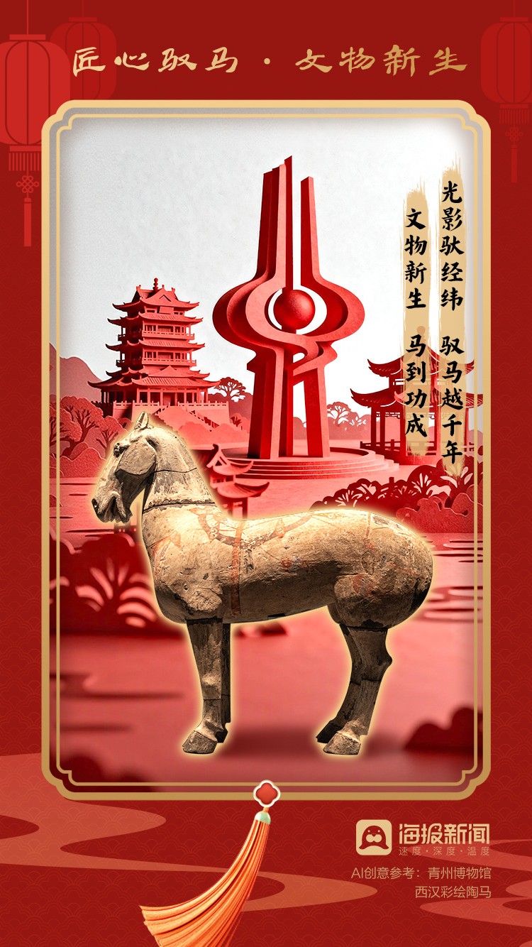 以“馬”為創(chuàng)意紐帶,融合山東孔廟儒風(fēng)、泰山巍峨、黃河奔涌、文物煥彩、海洋浩瀚等元素,推出系列新春海報(bào),盡顯齊魯文化賡續(xù)、山河錦繡、古韻新生、藍(lán)海騰飛、鄉(xiāng)野煥活、科創(chuàng)領(lǐng)航之盛景。