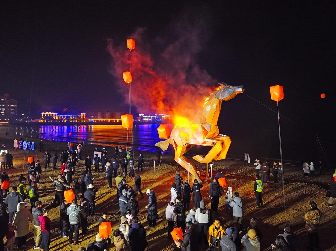 夜幕降臨,“赤驥騰春 好運(yùn)環(huán)翠”2026新春嘉年華活動準(zhǔn)時開演,主題光影秀、非遺魚燈巡游、打鐵花等節(jié)目輪番上演,營造出濱?!安灰固臁钡臒狒[景象。尤其是“赤驥騰春”藝術(shù)燈光秀,將奔馳的赤驥與燈光、煙霧融合,呈現(xiàn)出富有視覺沖擊力的藝術(shù)景觀?!斑@個裝置主體由廢舊鋼鐵、快遞箱紙殼等回收材料構(gòu)建而成,體現(xiàn)了綠色環(huán)保的理念?!背囿K設(shè)計(jì)師鄭旭光介紹。