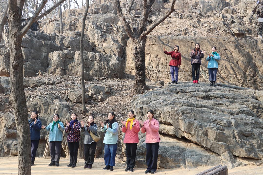 “人人那個都說哎,沂蒙山好!沂蒙那個山上哎,好風(fēng)光……”2月18日,農(nóng)歷正月初二,沂南縣馬牧池鄉(xiāng)常山莊村的山東紅嫂家鄉(xiāng)旅游區(qū)里,歌聲從常山上一塊黝黑的巨大山石上面?zhèn)鱽?,演唱者是紅嫂家鄉(xiāng)旅游區(qū)藝術(shù)團(tuán)的三名女演員,石頭下面7名女演員整齊地排成一隊(duì)和聲,由于演唱形式新穎,吸引了眾多外地游客。這種備受游客喜歡的演唱,今年春節(jié)假期每天演出兩場。