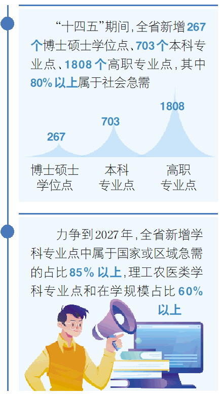 目前,全省高校共設(shè)置1300余個博士碩士學位點、3800余個本科專業(yè)點、5100余個高職專業(yè)點,理工農(nóng)醫(yī)類在校生占比達到61.6%,形成基本動態(tài)適配現(xiàn)代化產(chǎn)業(yè)體系、全面支撐經(jīng)濟社會高質(zhì)量發(fā)展的學科專業(yè)總體布局。