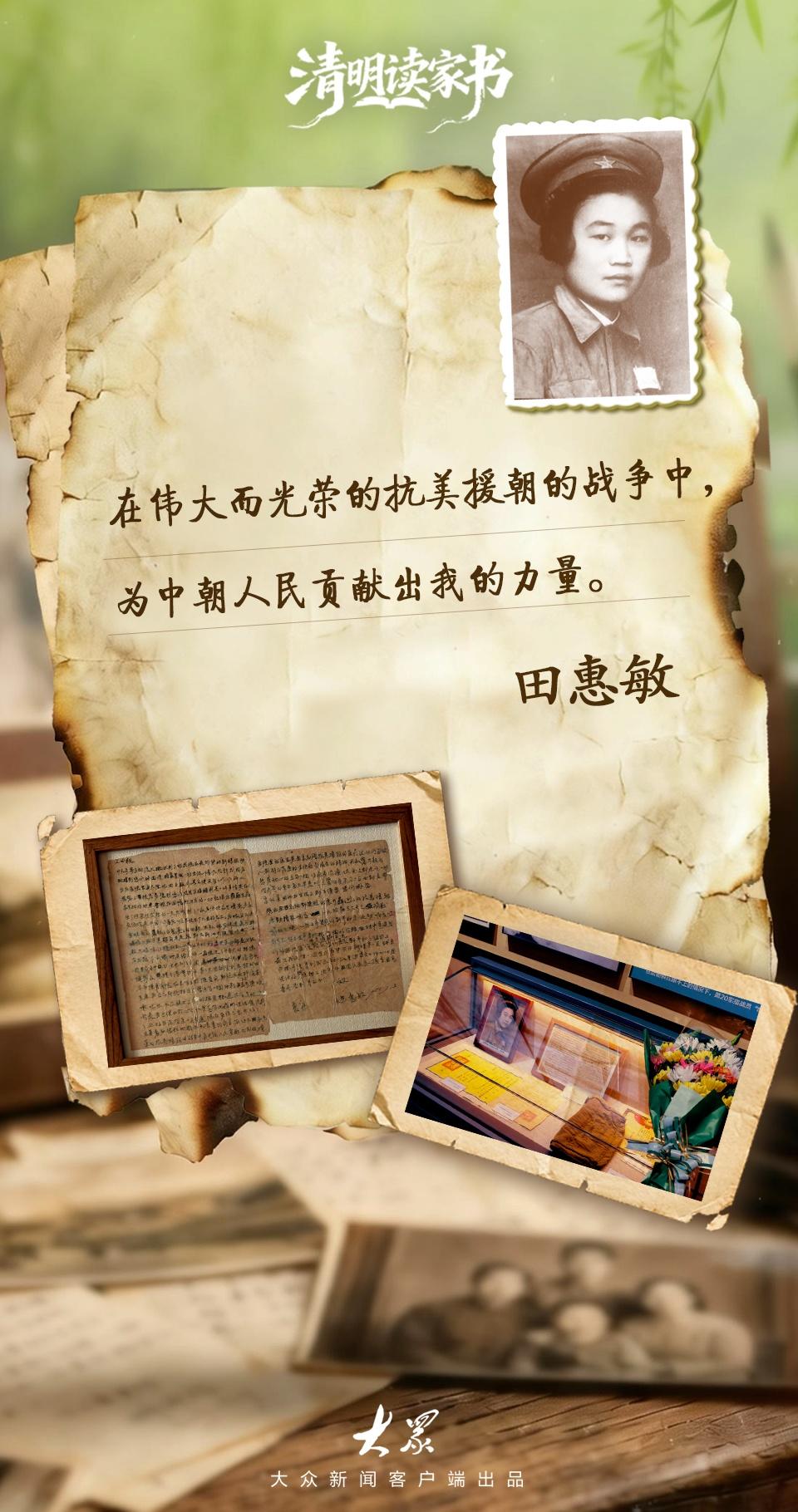 1951年,田惠敏回國(guó)治療。在醫(yī)院里,她寫下了人生中最后一封家書。信中既有對(duì)白發(fā)雙親的深深牽掛,更寫滿了重返前線的堅(jiān)定決心。傷愈后,她本可留在國(guó)內(nèi),卻毅然選擇二次請(qǐng)纓。1951年9月8日,她在執(zhí)行任務(wù)途中遭敵機(jī)轟炸壯烈犧牲。一封家書,寫盡赤子之心;兩次奔赴,詮釋家國(guó)大義。她將21歲的滾燙青春,永遠(yuǎn)定格在了異國(guó)他鄉(xiāng)的土地上。